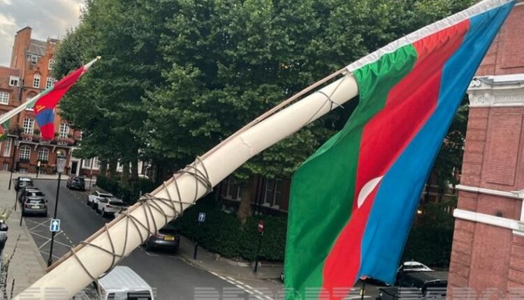Azərbaycan Respublikasının Böyük Britaniya və Şimali İrlandiya Birləşmiş Krallığındakı səfirliyinə bir qrup radikal dini dəstənin hücumu zamanı çıxarılan Azərbaycan bayrağı yenidən yerinə bərkidilib.